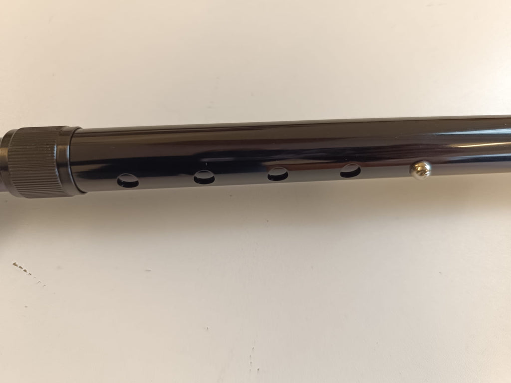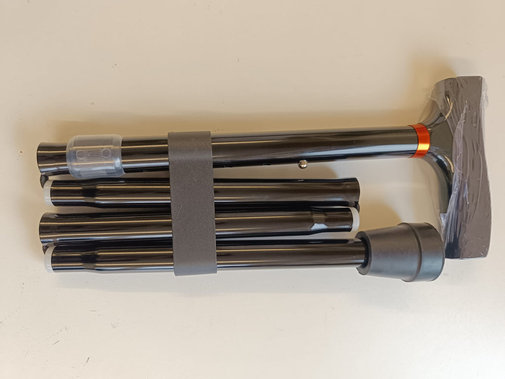 Höhenverstellbarer und faltbarer Gehstock aus Aluminium, schwarz, mit schwarzem Handgriff.