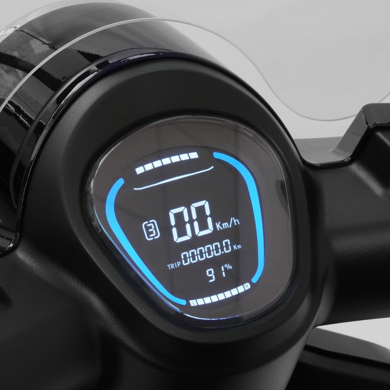 Digitales Display zur Anzeige von Geschwindigkeit, Akkustand und Reichweite.